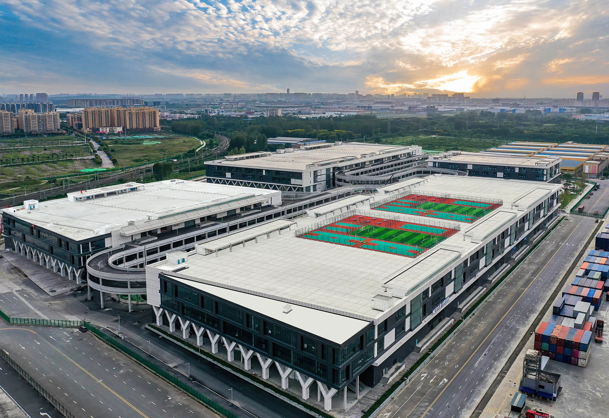 成都国际铁路港综合保税区标准化厂房占地289亩,总建筑面积28.55万㎡,由四栋三层厂房、动力中心和坡道...