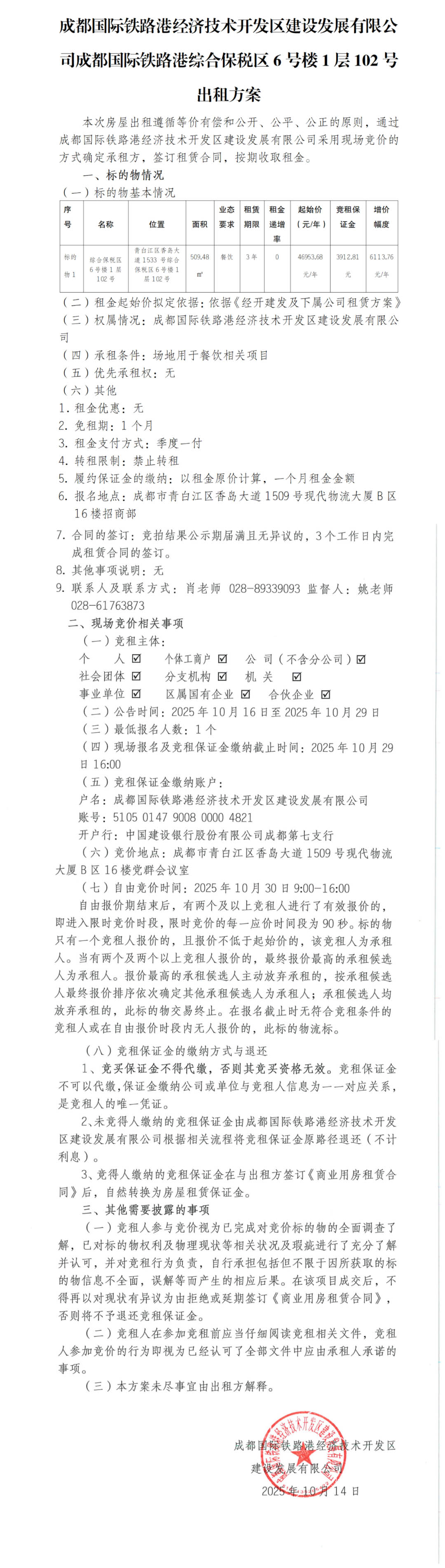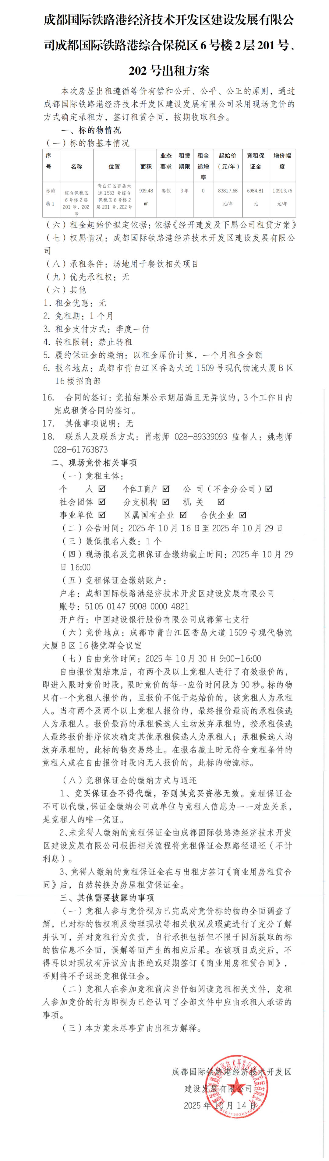 成都国际铁路港经济技术开发区建设发展有限公司资产出租公告