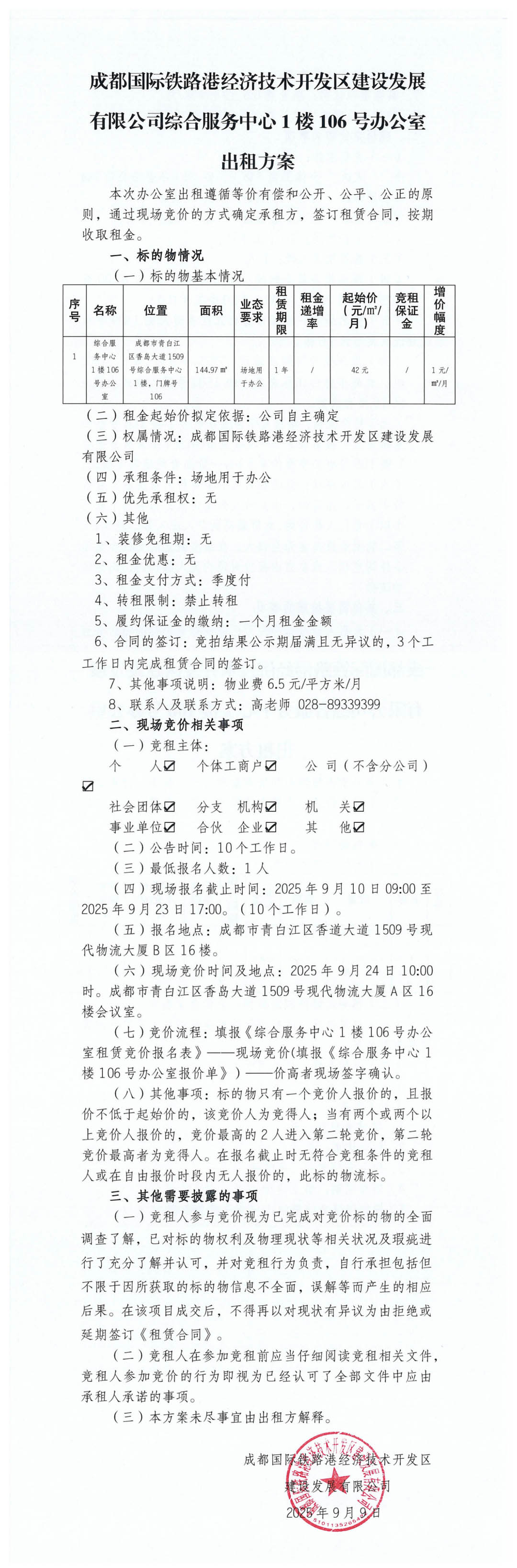 成都国际铁路港经济技术开发区建设发展有限公司资产出租公告